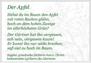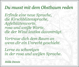 Der Obstbaum als Jahreskreis, als Sinnbild für den Lebenskreis des Menschen. Wachsen und werden, Jugendblüte, Reife, Vergehen und Tod. Der eigene Obstgarten als kleines Paradies. Jeder Baum darin dein dankbarer Freund. Klicke auf oben stehenden Button um mehr zu erfahren.